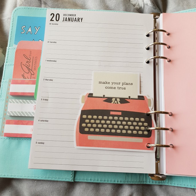 Diary pages are a must, but I also slip in “to do list” sheets and plenty of blank lined sheets for writing notes, journal entries, basically anything I feel I need to take note of. I also make sure to have some post-it notes and sticky page markers handy for when whatever I need to write doesn’t need to be in or be able to fit in a single day’s entry space. I also make use of loose elements like notepaper, photos, keepsakes etc. by paper clipping them in on relevant pages to keep them safe and tidy.
